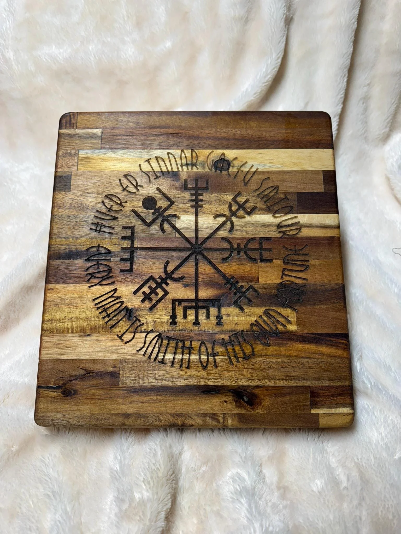 These handcrafted maple and acacia cutting boards can be designed to your preferred size, shape and design. These boards are heirloom quality and accentuate any kitchen décor. Made from ethically sourced acacia wood, this board features food-safe finishes that protect its rich grain and ensure safe meal prep. Each piece is carefully designed shaped by hand in my Iowa workshop using butcher block and maple sourced from the Habitat For Humanity Restore Optional personalization available—personalized designs, family initials, designs, or a name to make it truly one-of-a-kind. Whether you're gifting it to a Viking at heart or treating your own hearth and home, this cutting board embodies strength, style, and sustainability. Enjoy free shipping within the continental U.S. (lower 48 states). Please note: Hawaii and Alaska are not included and will incur additional shipping charges.