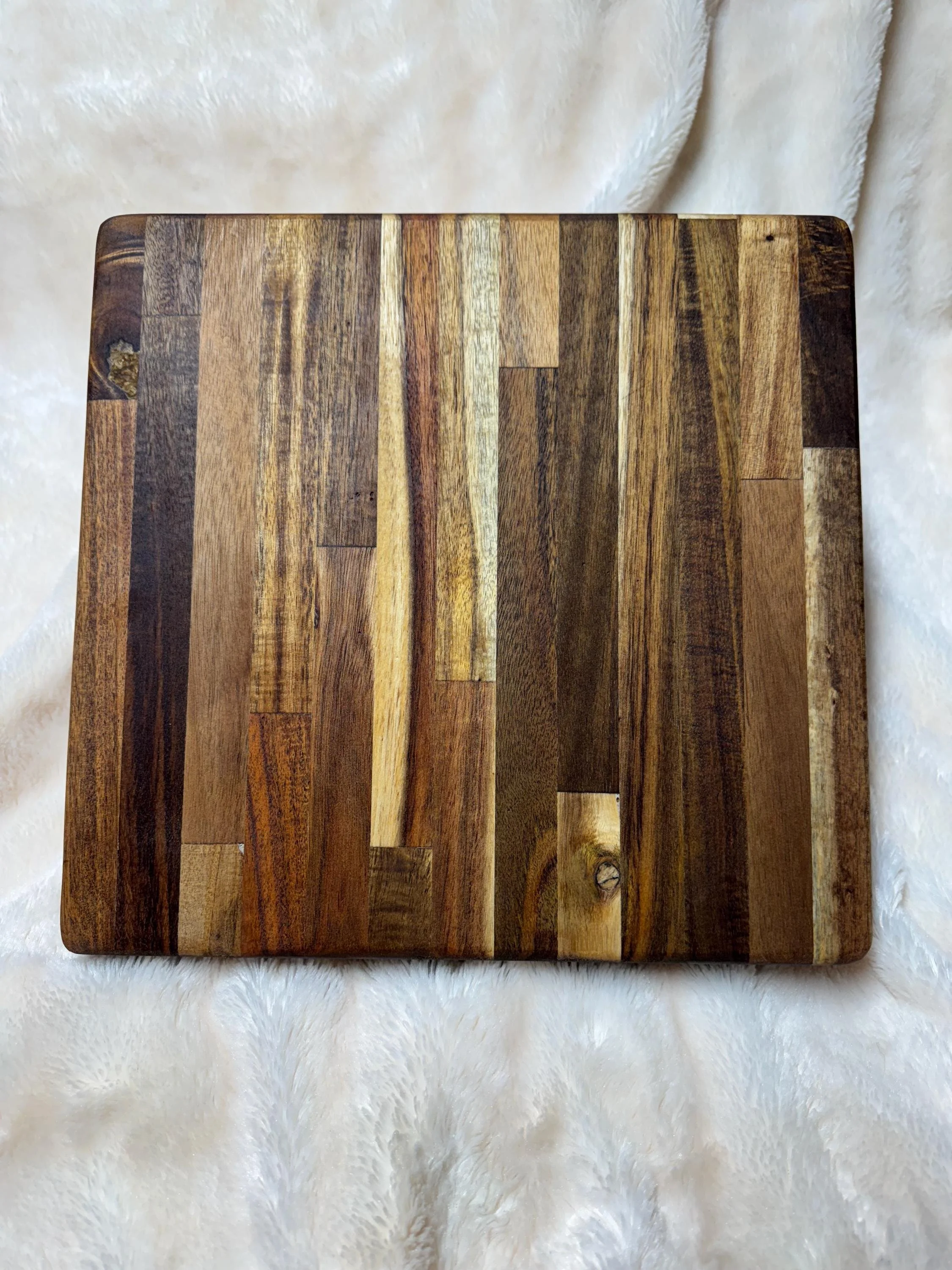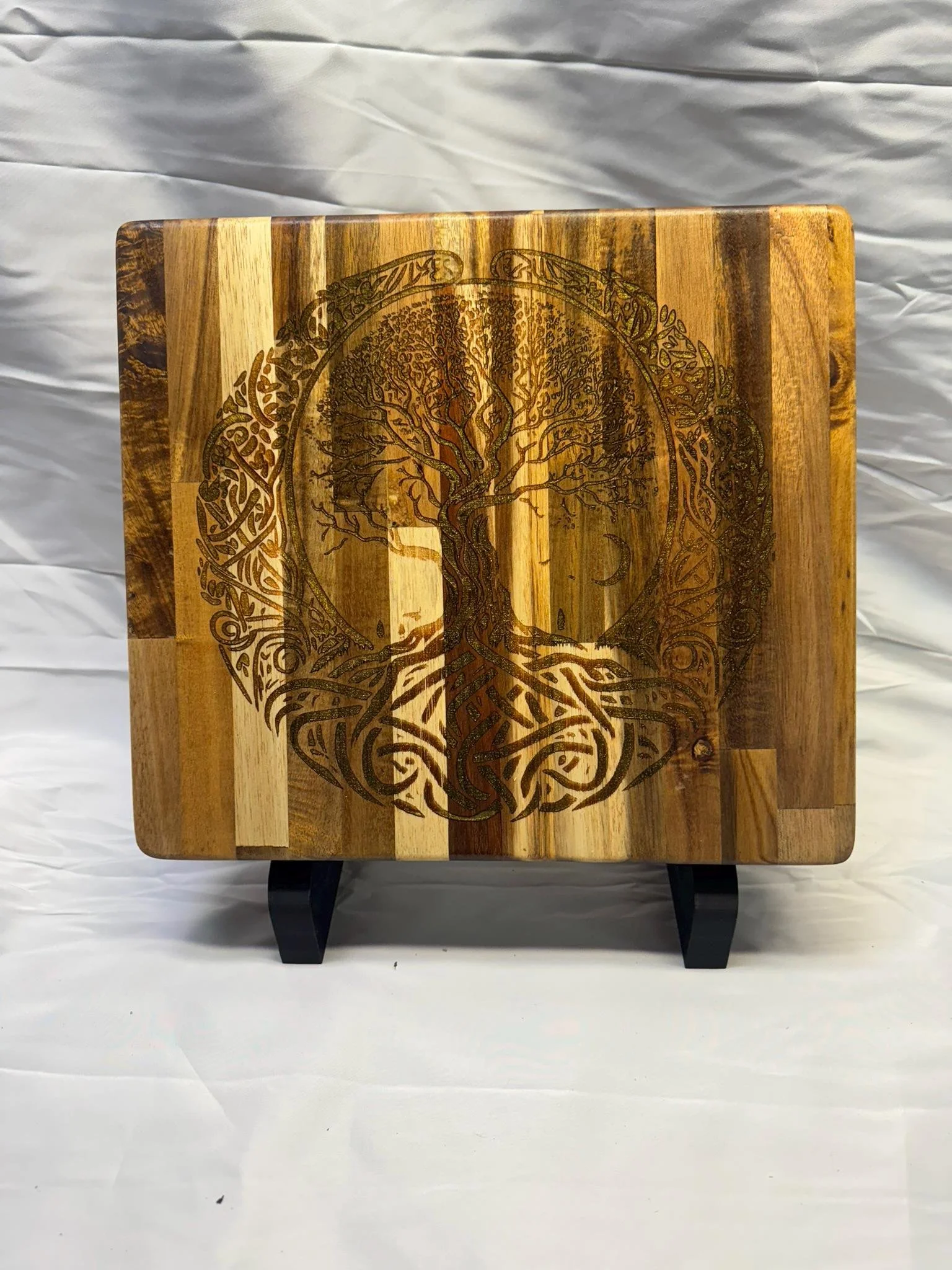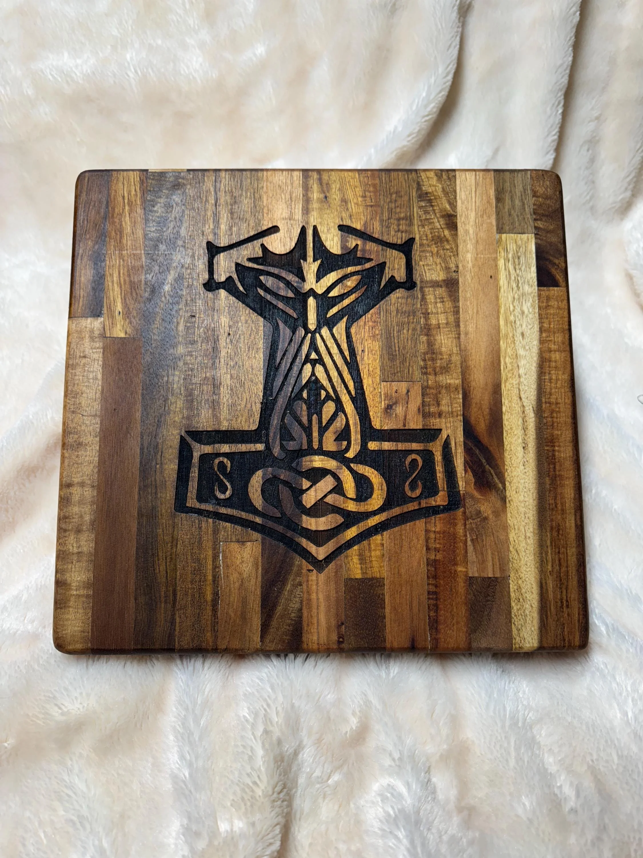 These handcrafted maple and acacia cutting boards can be designed to your preferred size, shape and design. These boards are heirloom quality and accentuate any kitchen décor. Made from ethically sourced acacia wood, this board features food-safe finishes that protect its rich grain and ensure safe meal prep. Each piece is carefully designed shaped by hand in my Iowa workshop using butcher block and maple sourced from the Habitat For Humanity Restore Optional personalization available—personalized designs, family initials, designs, or a name to make it truly one-of-a-kind. Whether you're gifting it to a Viking at heart or treating your own hearth and home, this cutting board embodies strength, style, and sustainability. Enjoy free shipping within the continental U.S. (lower 48 states). Please note: Hawaii and Alaska are not included and will incur additional shipping charges.